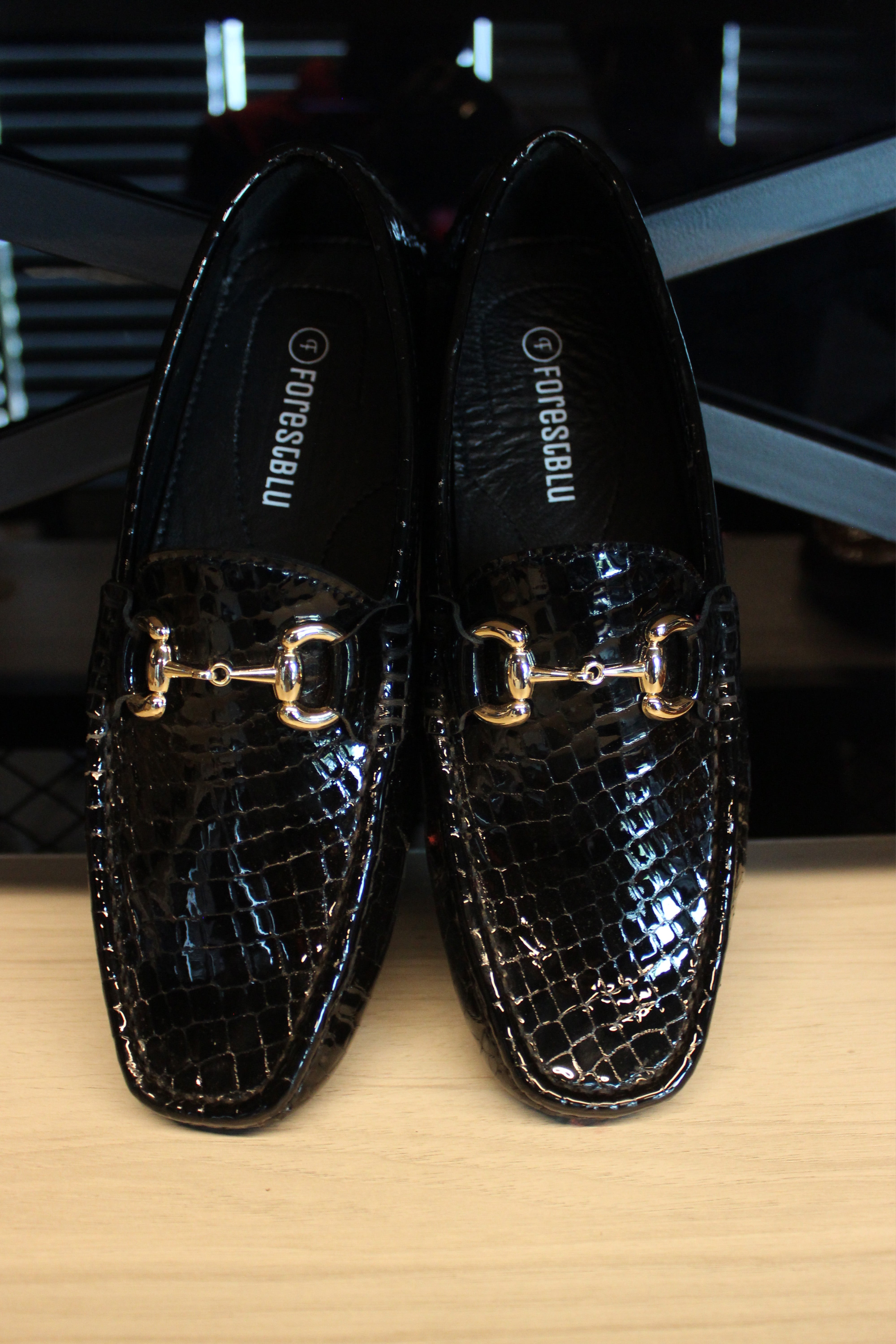 Bold and refined, these glossy croc-textured loafers with metal bit detailing make a statement wherever you go.