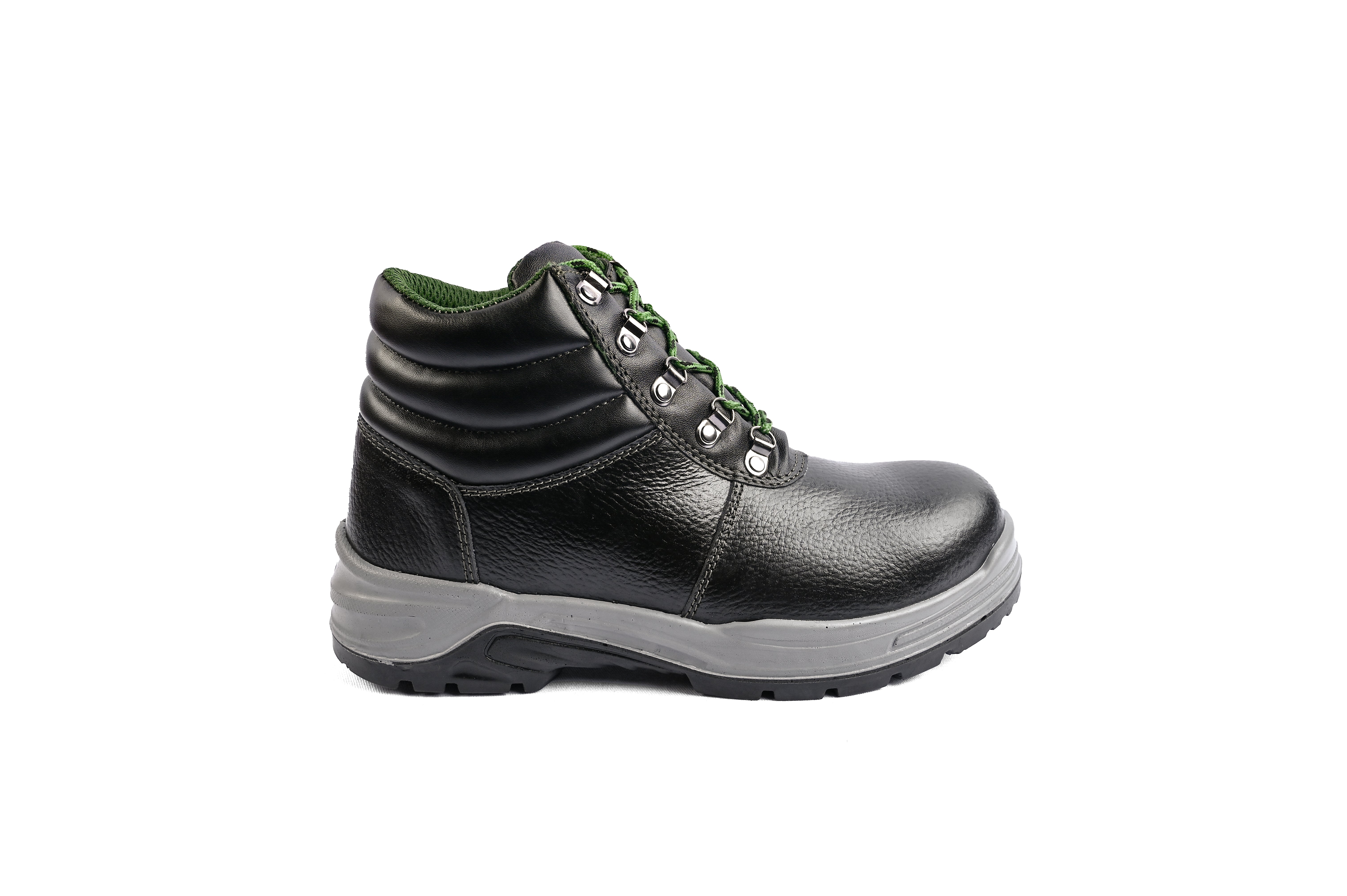 Step up your style and safety with our SafeStride Black Leather Boots. The green accents add a touch of personality, while the safe and durable leather construction ensures protection for your feet. Look good and feel confident with every step.